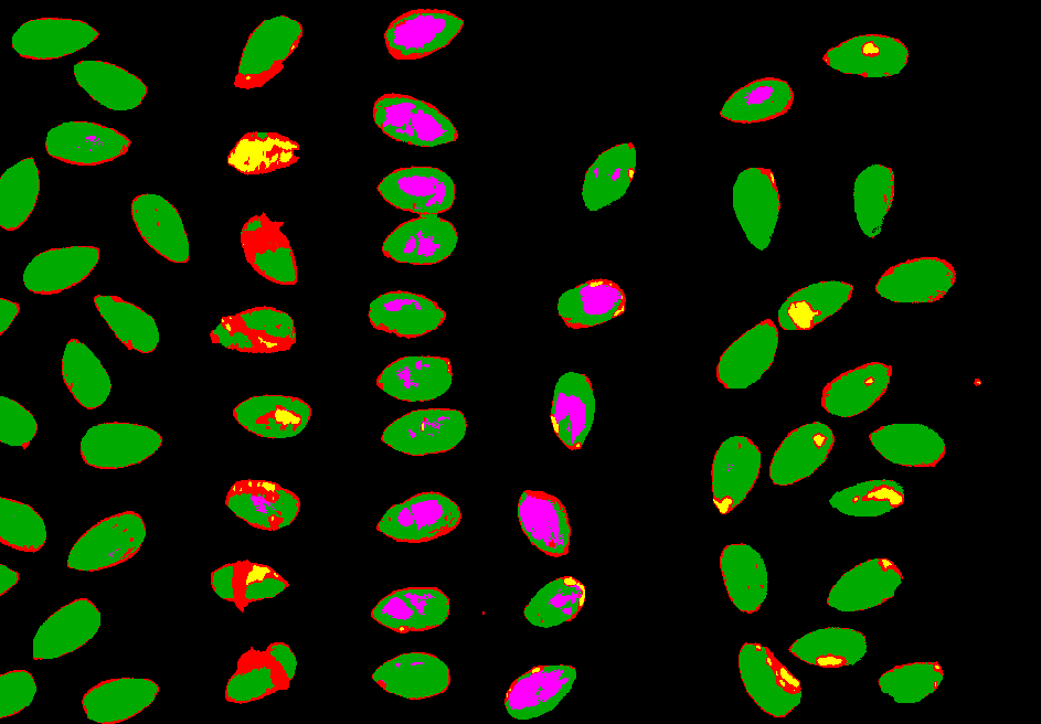 Hyperspectral cube of pistachio nuts. Unlike standard RGB sorting grading systems our hyperspectral imaging system detects the chemical makeup of the produce so even same colour materials and foreign matter can be easily detected and segregated.